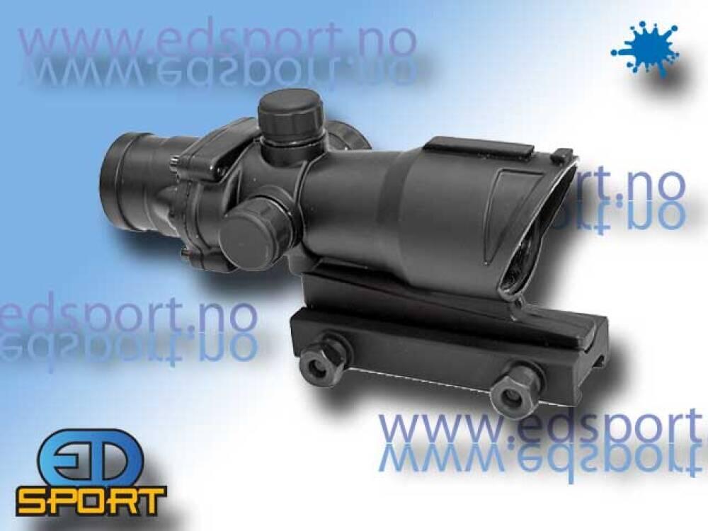 Rødpunktsikte med "cap" på front linsen. Støpt i en gummiert form for gi optimal beskyttelse mot regn og fuktighet. Fastmontert på Mount rail gjør at den bygger godt opp i høyde