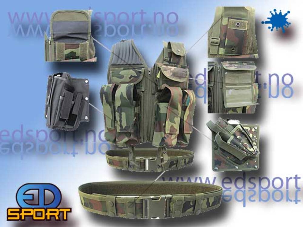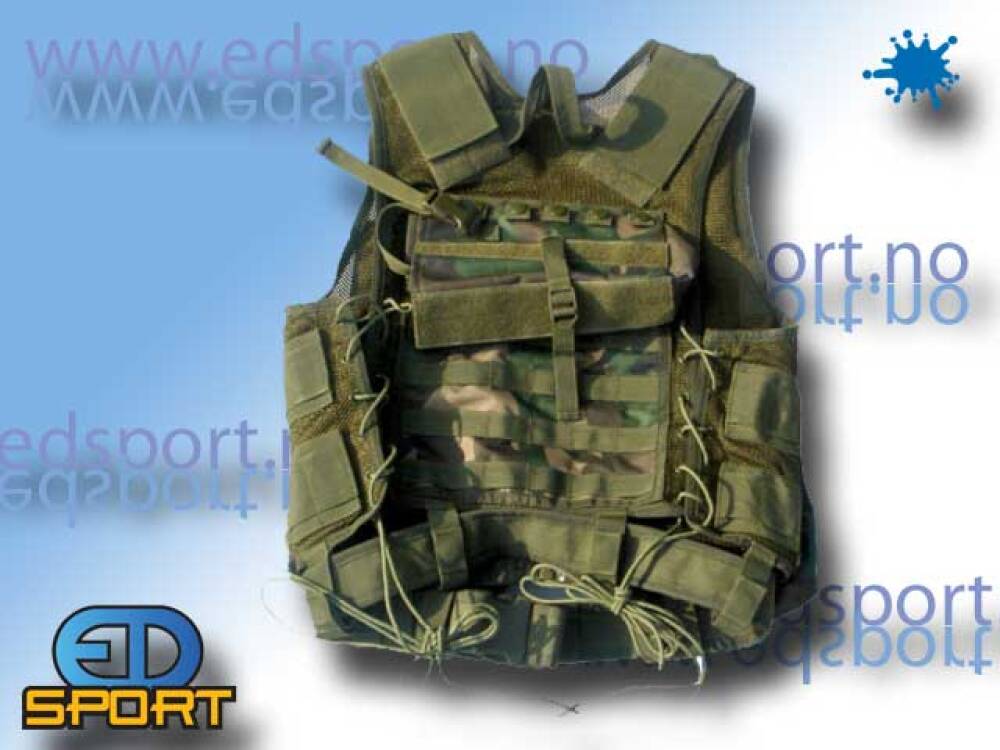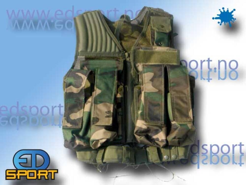 Paintballvest fra Bullstrike i stilig woodland camo mønster. Vest med mange lommer for diverse paintball utstyr. Stor flaskelommer vertikalt på ryggen